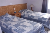 Chambre avec lits jumeaux, douche et toilettes à partager.